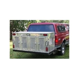 Aluminum Dog Box custom made by Creative Sports Supply 4-hole compartments or could be converted to a 2 compartment dog box. Box measures 72"L x 32"D x 32"H. Each compartment measures 16"W x 30"D x 26"H. There is a storage compartment in the top that measures 69"L x 31"W x 6"D. The inside is insulated on the outside walls and floor. Tail lights and backup lights are also installed in the box. Box is well vented and has removable vent shields in each door.